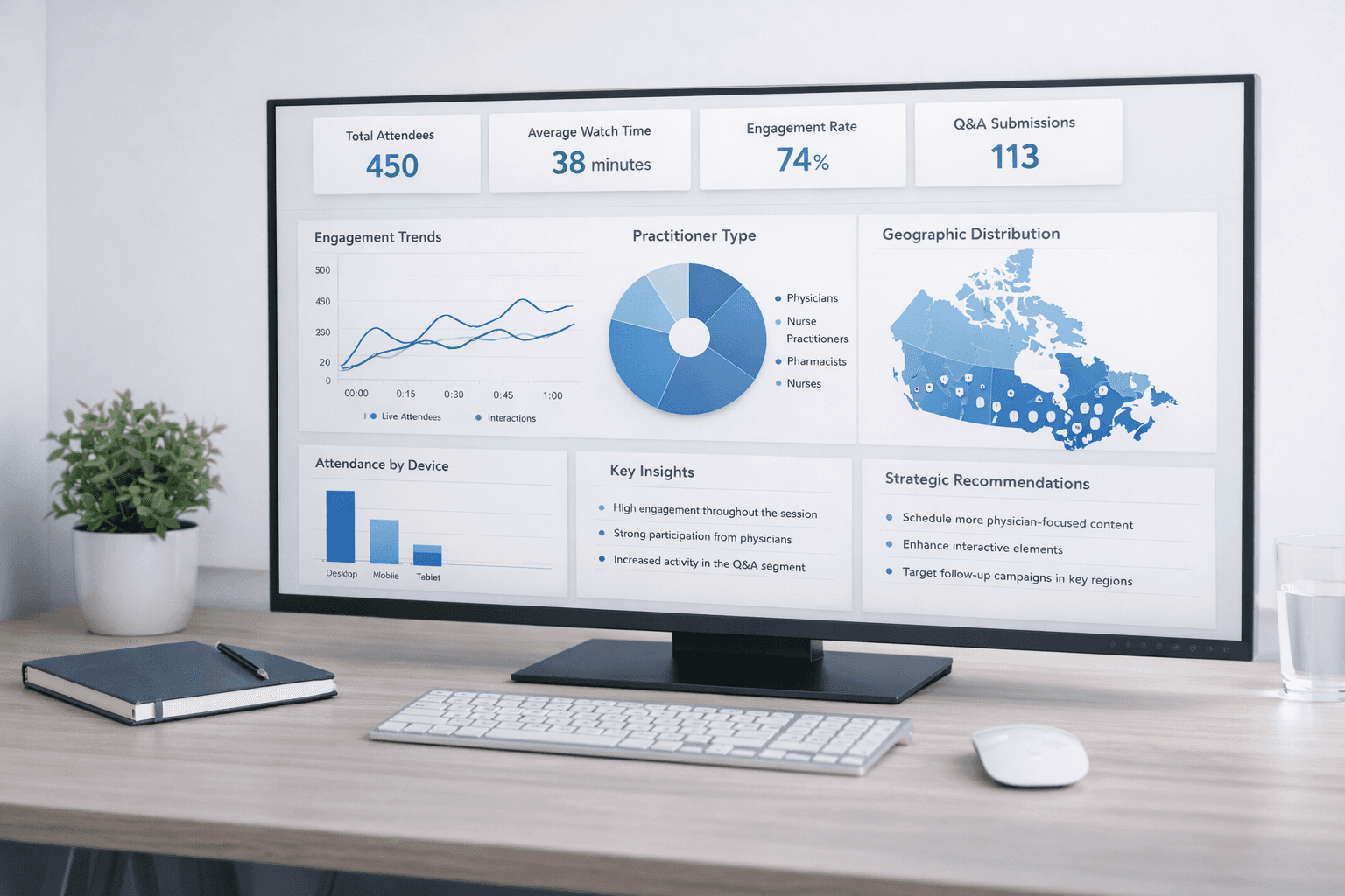 A single national clinical webinar delivered strong audience engagement, but the real value emerged in what happened afterwards. Through targeted promotion, seamless program delivery, and integrated engagement analytics, the program generated meaningful participation from healthcare professionals across Canada while revealing valuable insights about audience behaviour and clinical learning needs.